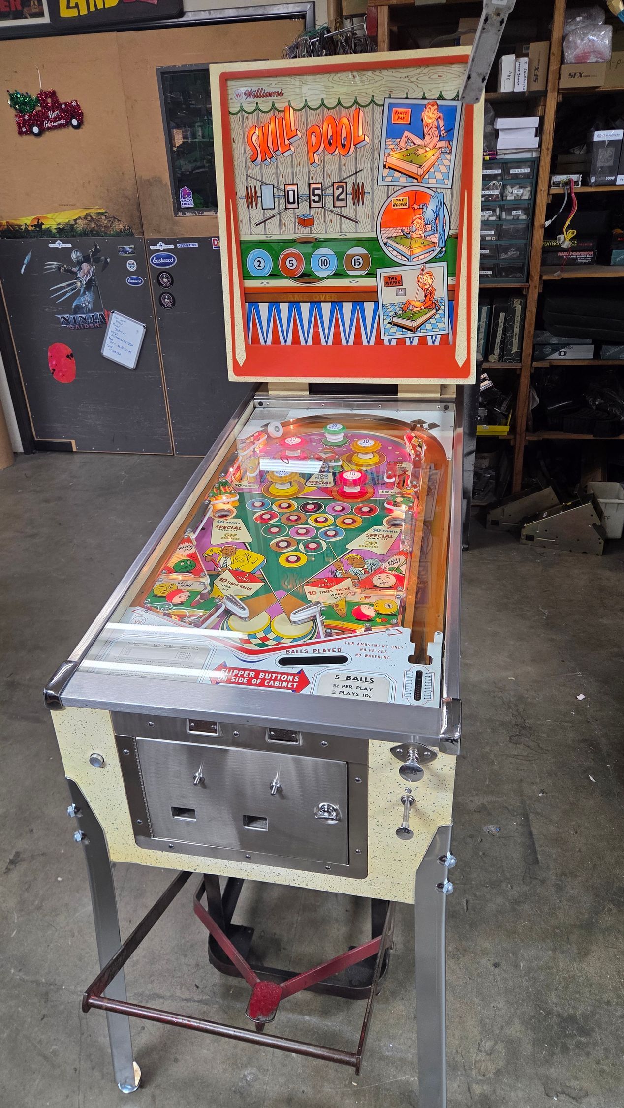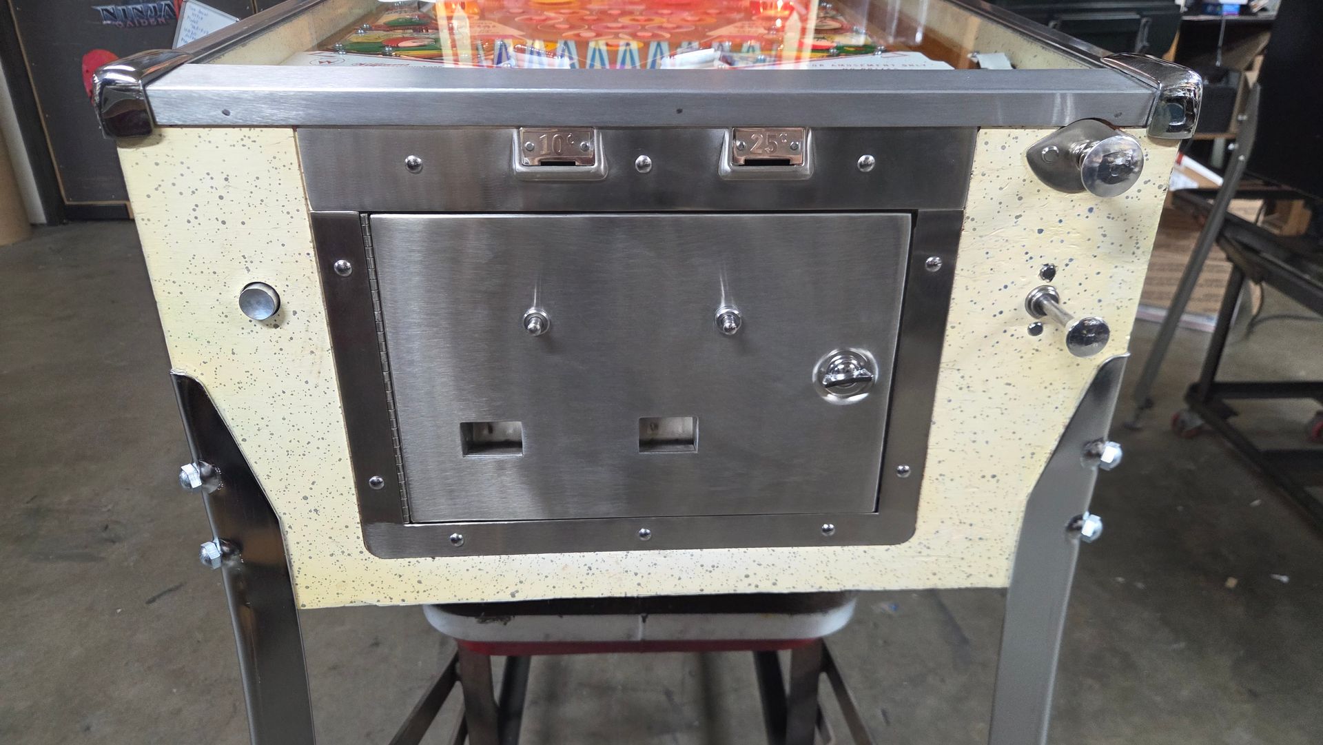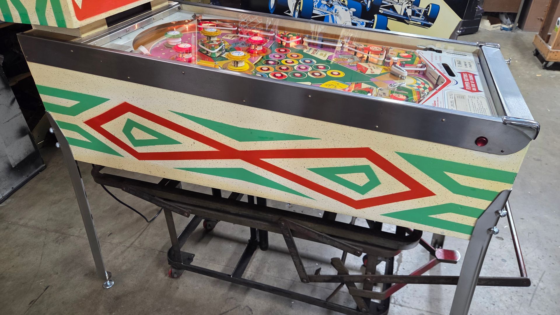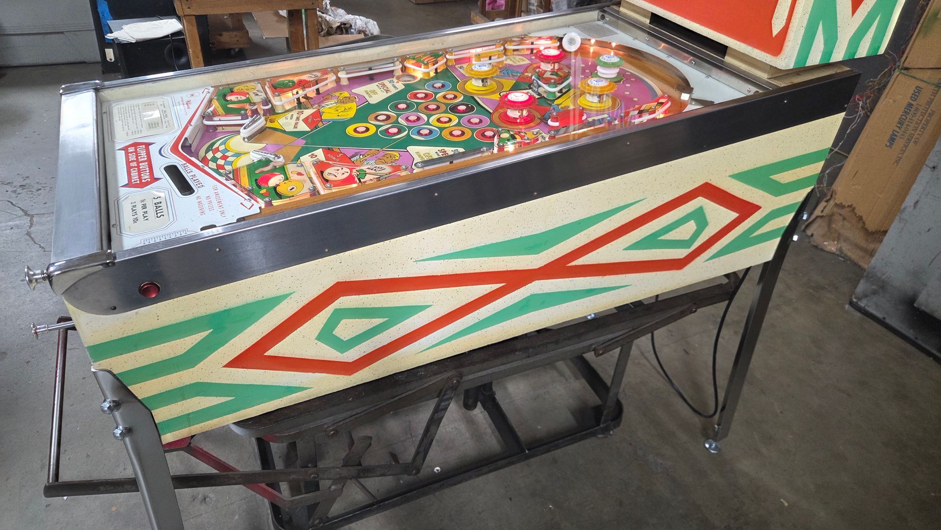 It's hard to believe this game is over 60 years old. It is a real beauty, and a lot was put into it to make it as nice as possible while maintaining originality. The game has been fully shopped and gone through. Flippers and pop bumpers have been fully rebuilt. Lots of metal bits were professionally plated to match how it would have looked out of the factory. New legs and playfield glass, among other parts. Cabinet and playfield touched up. Not a game you see too often, and the reverse wedgeheads of this era from Williams always catch people's eye. It looks great and plays even better.
