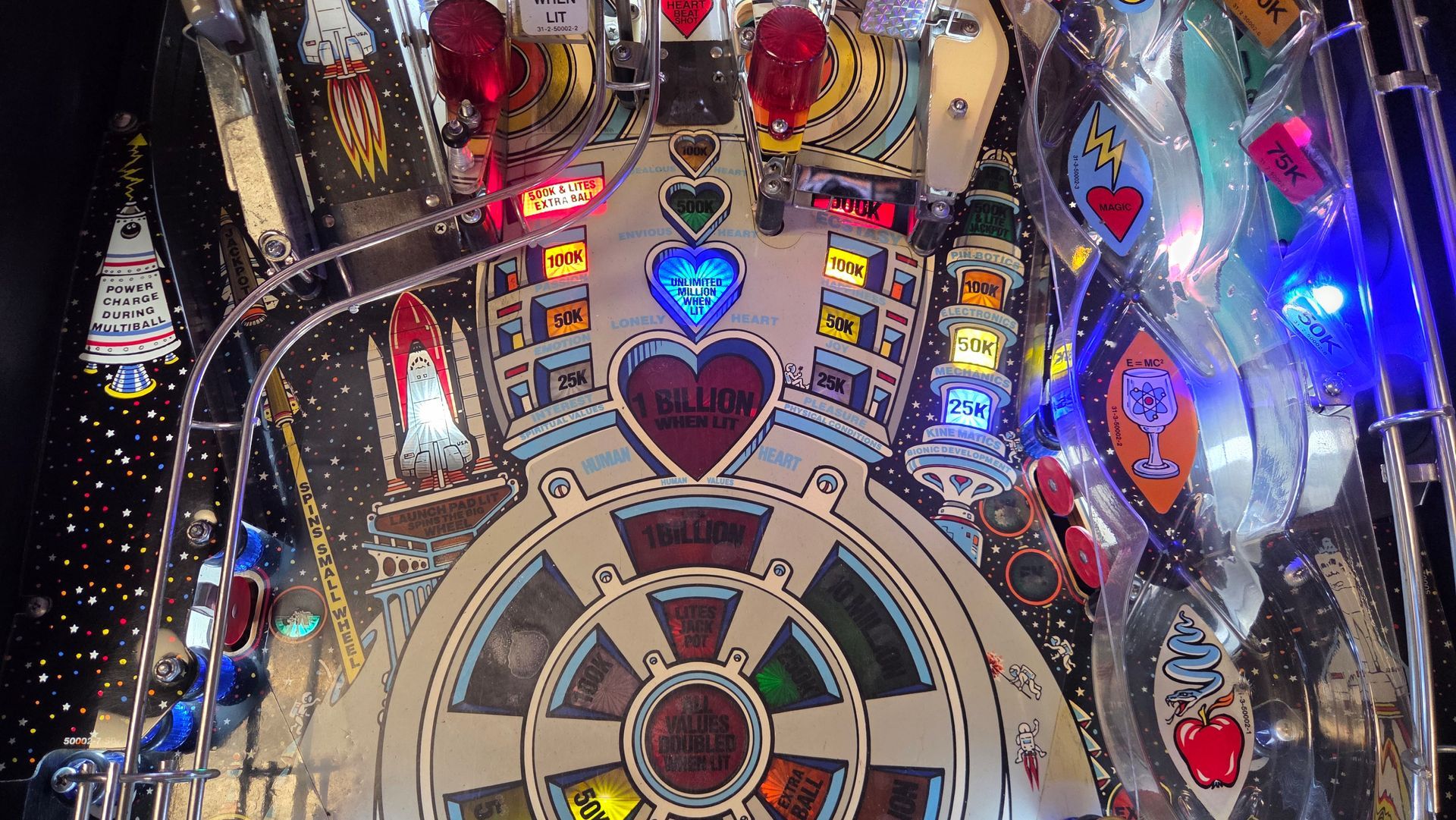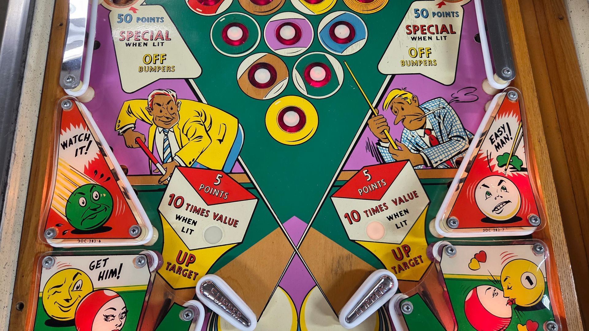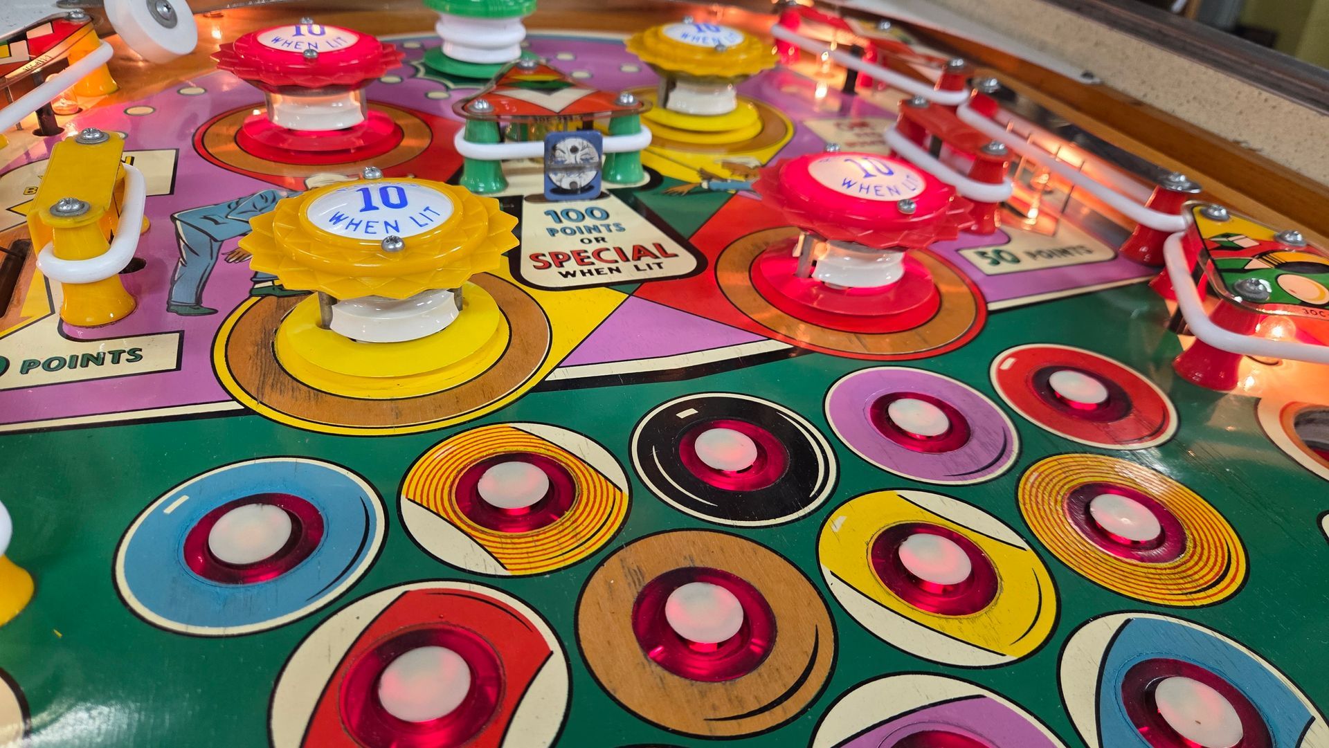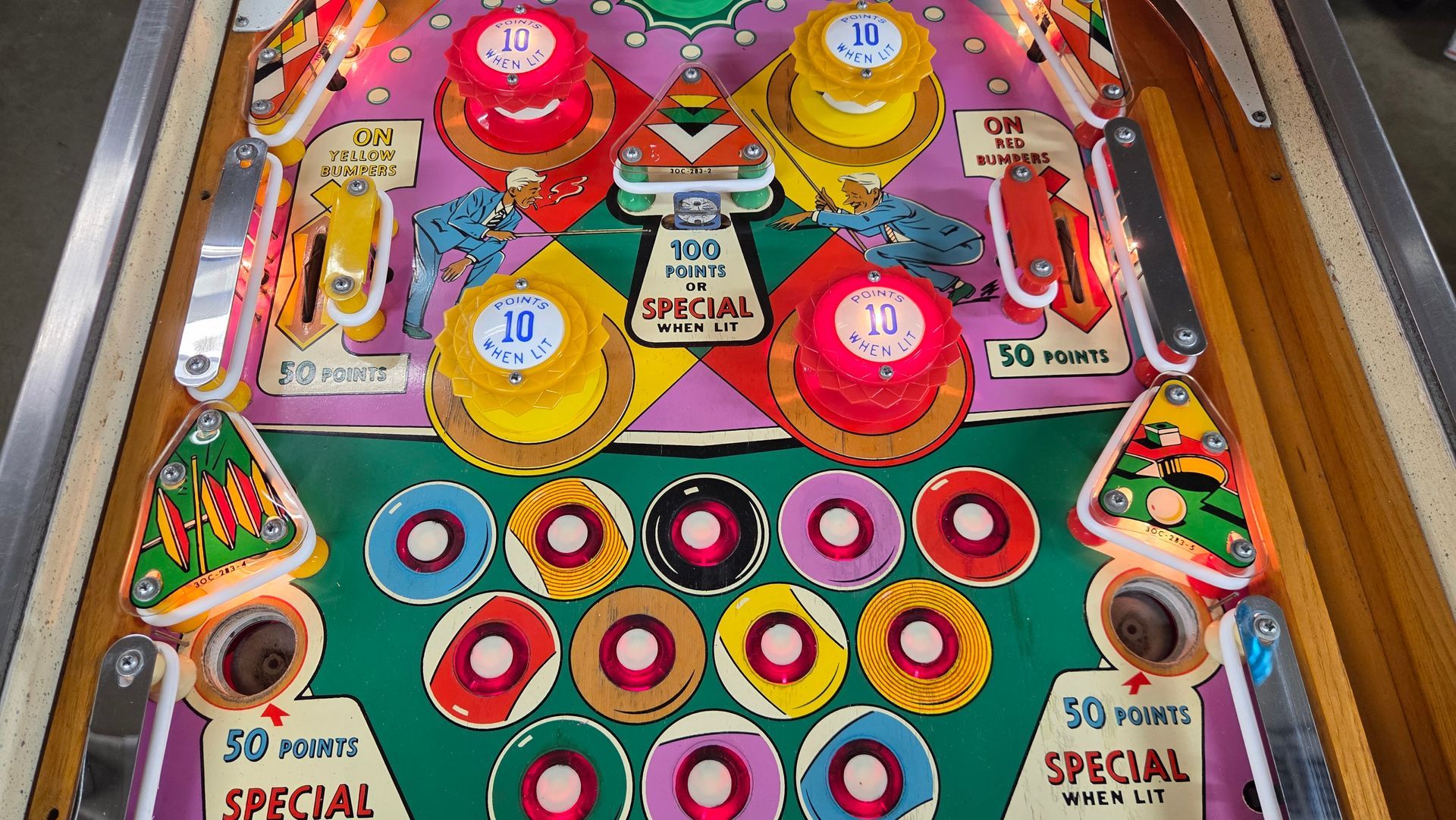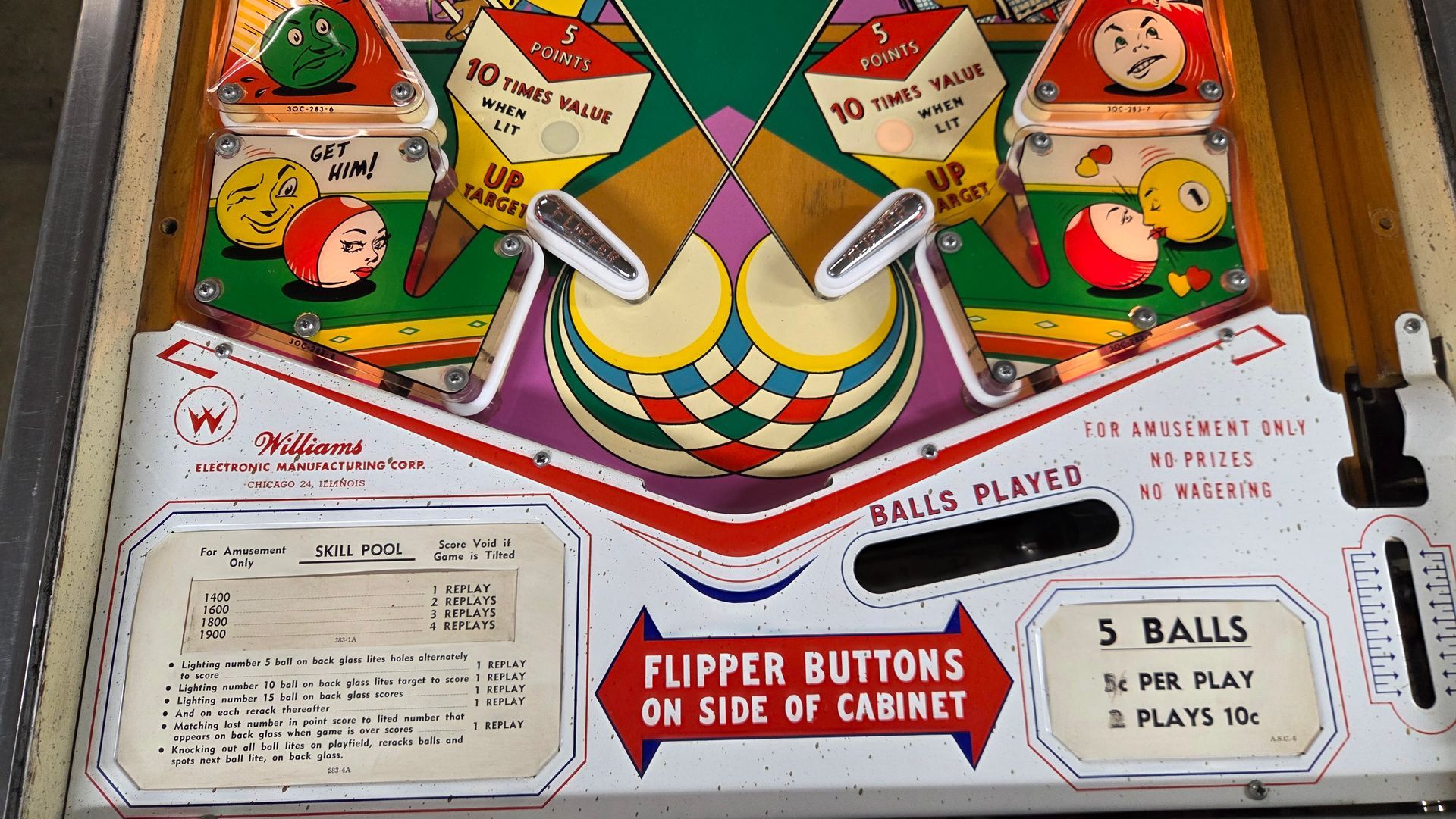 It's hard to believe this game is over 60 years old. It is a real beauty, and a lot was put into it to make it as nice as possible while maintaining originality. The game has been fully shopped and gone through. Flippers and pop bumpers have been fully rebuilt. Lots of metal bits were professionally plated to match how it would have looked out of the factory. New legs and playfield glass, among other parts. Cabinet and playfield touched up. Not a game you see too often, and the reverse wedgeheads of this era from Williams always catch people's eye. It looks great and plays even better.